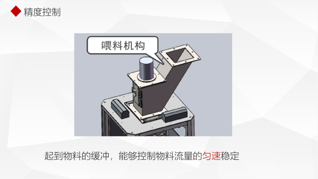 剛才了解到這款包裝機的整個結構,包括性能各方面,我們再來了解一下這款包裝機的精度控制,說到精度控制,也是大家非常關注的一個重點。首先,喂料機構為什么是這樣的一個形狀?主要是為了控制物料流量的勻速所設定的。固定的過渡料倉,因為料倉的大小和儲存的物料有一個非常直接的壓力,會導致包裝物料的流量有一些不穩定的狀態,通過這個喂料機構能夠勻速地將物料流量控制地更加穩定。