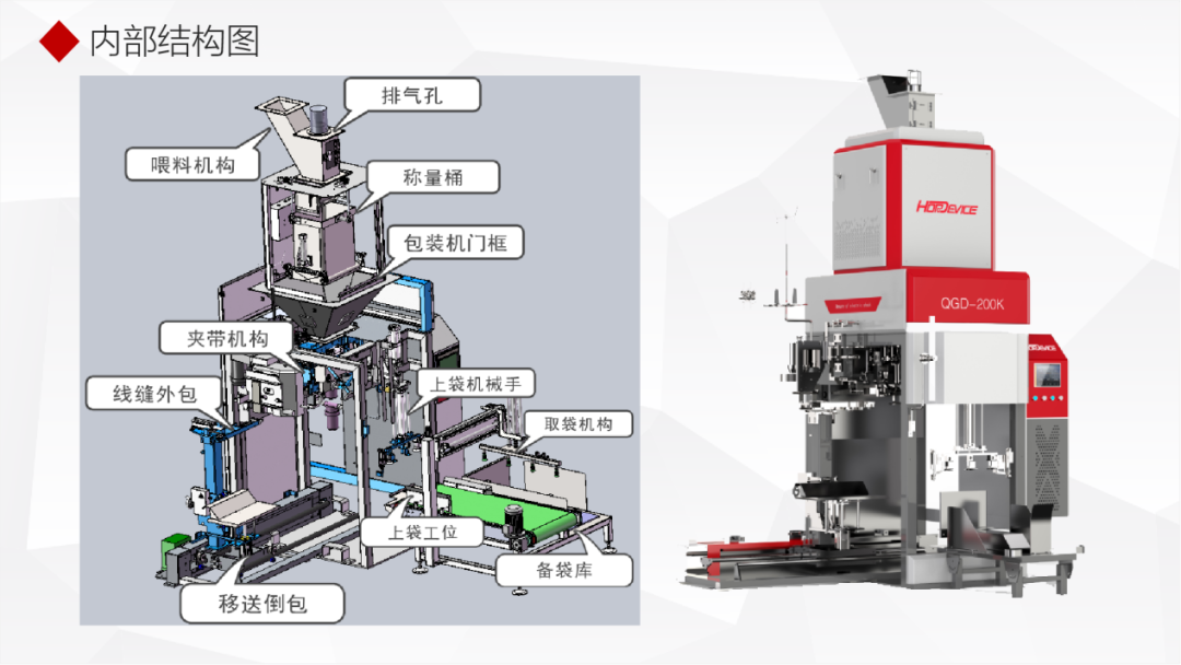 接下來,我們來了解下這款專門為改性行業定制的QGD-200K型的全自動包裝機,從外觀上看非常靚麗,顏值也非常高。它內部的結構,首先是喂料機構,通過將物料自動喂料,經過弧形門的控制,將物料投入到自動稱量的稱量桶。備袋庫中儲存的空包裝袋,通過取袋的機械手將包裝袋取袋進入到上袋的工位,上袋的機械手將上袋工位的包裝袋自動取袋掛入到夾袋結構,然后包裝好的一次性定量。