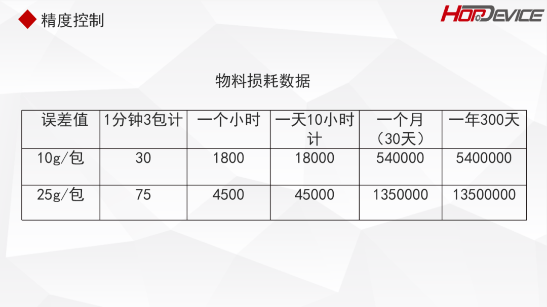 剛才所說的誤差只是在相差10g的這種誤差,如果按照常規的正負千分之二的這種誤差,那么1分鐘相差的重量是75g;一個小時,4500g;一天,是45000g;一年的數據相當驚人,換算成噸位的話,是13.5噸。所以說我們在整個生產過程中包裝精度是非常關鍵的一個點!