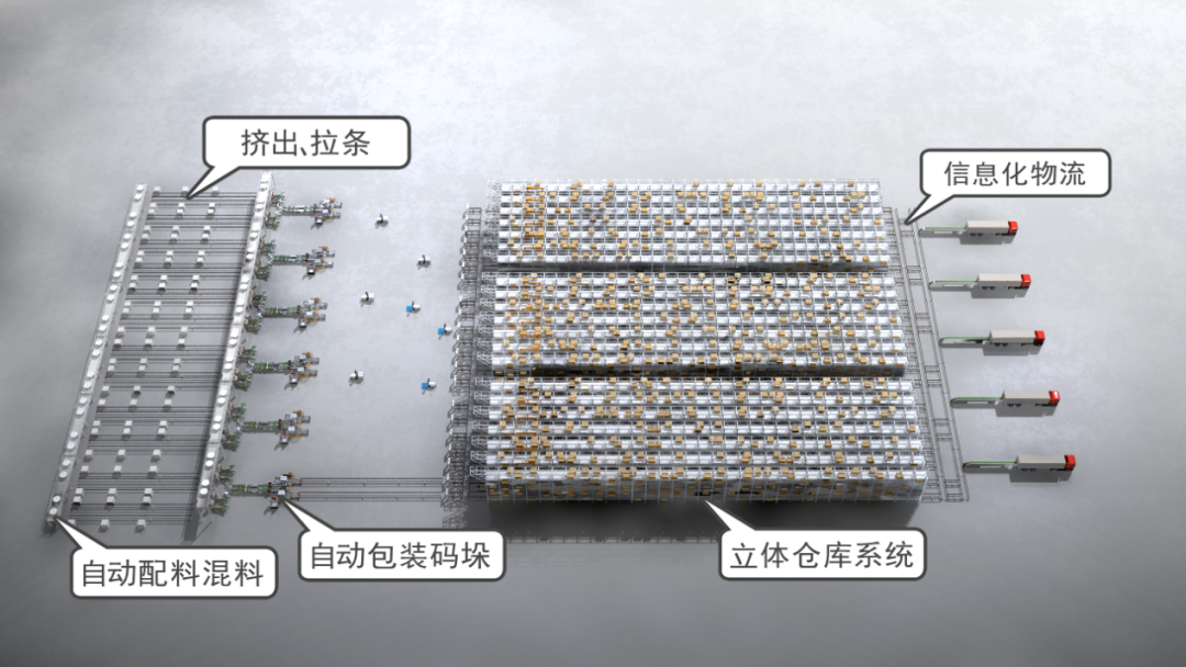 接下來,通過這一張智能工廠的全覽圖,我們一起來大致了解下未來智能工廠的一個模樣,從前端的自動化混料、配料到擠出、造粒,到后端的自動化包裝碼垛,通過AGV自動的出入庫到立體倉儲系統結合我們的信息化物流,從而實現了高產出、高智能、低能耗的數字化管理。
