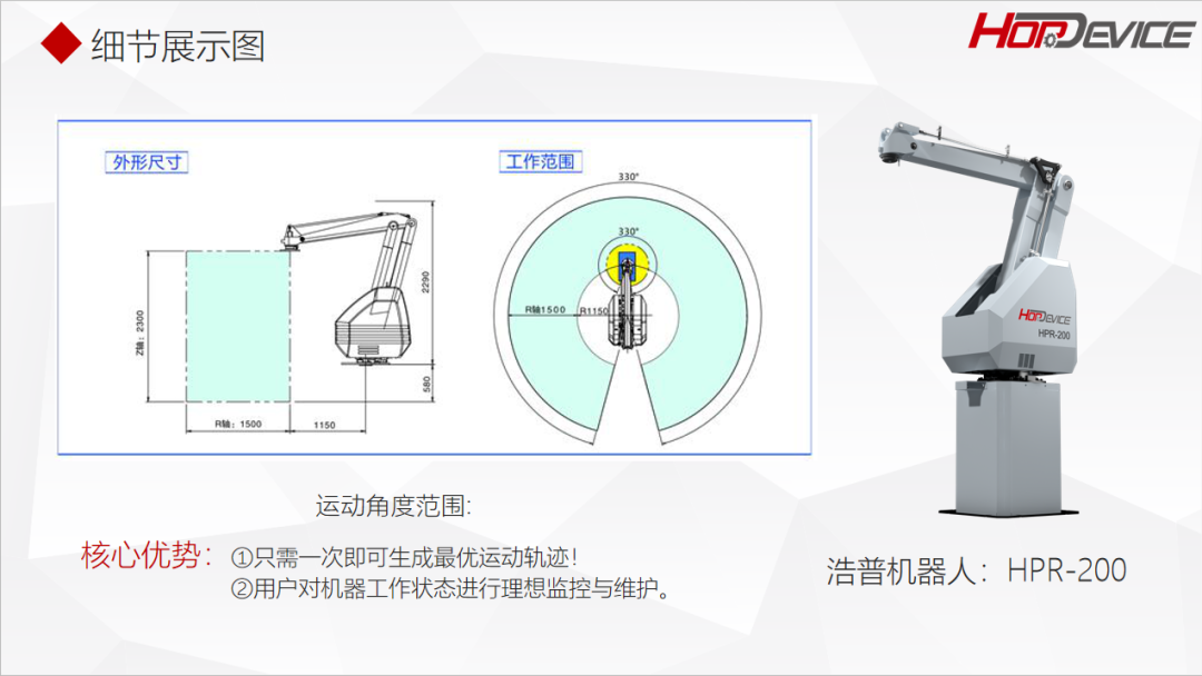 我們剛才了解了全自動的包裝機,再來一起看一下浩普生產的這款HPR-200的碼垛機器人。首先我們從外觀上看到非常的厚實,看起來給人感覺非常的穩重,也是相當帥氣!