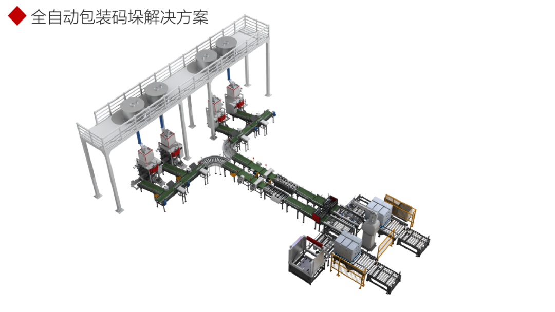 在方案圖中我們可以看到這是一個從全自動的包裝以及自動化碼垛的整體解決方案。 首先可以看到,整個現場生產線有四條,通過真空送料系統將成品物料送入到過渡料倉(均化倉/儲料倉),通過重力式的方式,經過全自動的包裝機,包裝線縫,經過匯流并線輸送到后端自動化的碼垛環節。我們在生產線也設定了像重量檢測,金屬檢測剔除陣形,包括后端的噴碼輸送,壓包輸送等方式經過機器人進行碼垛,在整個項目中配備有自動的托盤庫系統,一次性可以儲存10-15個托盤,經過空托盤輸送,將空托盤輸送到碼垛輸送機的工位,機器人經過所設定好的程序和垛形,將碼垛完的產品輸送到插取輸送的工位,也可以將插取輸送成品的產品插取到倉庫,同時也可以對接后續的立體倉儲系統。