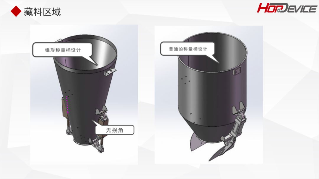 我們浩普智能針對改性塑料行業研究了很多年,所以每一個區域的一個細節,我們都會非常注重。還有一個藏料的區域是設計的這個錐形的稱量桶,普通的稱量桶形狀是這樣的,在稱量的過程中,它會殘留在箭頭所指的這個位置。當包裝物料通過直落的方式,相當于多給了它一條存料的機會線,但是我們所設計的這個錐形桶,他沒有這個死角。所以說在生產的過程中不能有任何殘留死角的機會,這樣的話才能做到整個包裝無死角、無殘留,通過我們定制的一款水洗包裝機,就能輕松地將殘留物料的問題輕松地解決掉。